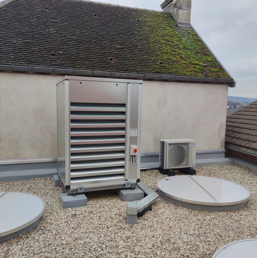 Le placement du VRV en toiture à nécessité d’installer le groupe dans un caisson acoustique afin de réduire les nuisances sonores.